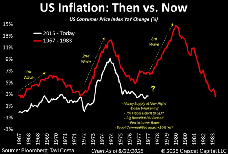 Le principali conseguenze negative che possono derivare dalla congiuntura attuale, nutrita dagli importanti stimoli fiscali derivanti dalla maggior spesa pubblica e dagli altrettanto potenti stimoli monetari derivanti dall’immissione di nuova liquidità da parte delle banche centrali, possono tutte sintetizzarsi in una sola parola: inflazione. Un’inflazione che potrebbe riproporre esattamente la stessa dinamica di cinquant’anni fa (vedi grafico):