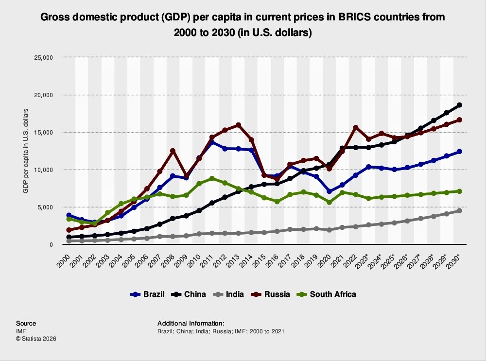 Oggi i Paesi BRICS (cioè inizialmente Brasile Russia India Cina e Sud Africa, ma dal 1/1/2024 anche Egitto, Etiopia, Emirati Arabi Uniti e Iran, oltre a quelli che sono definiti “Partner”: cioè Turchia (caso unico essendo membro NATO), Indonesia, Malesia, Thailandia, Vietnam, Cuba, Bolivia, Bielorussia, Algeria e Nigeria (con i quali si è formato un aggregato definito ”BRICS+”). Essi hanno unito le forze per creare istituzioni sovranazionali e i soli BRICS rappresentano già il 45% della popolazione mondiale e una sommatoria dei Prodotti Interni Lordi che supera quella dei Paesi del G7.